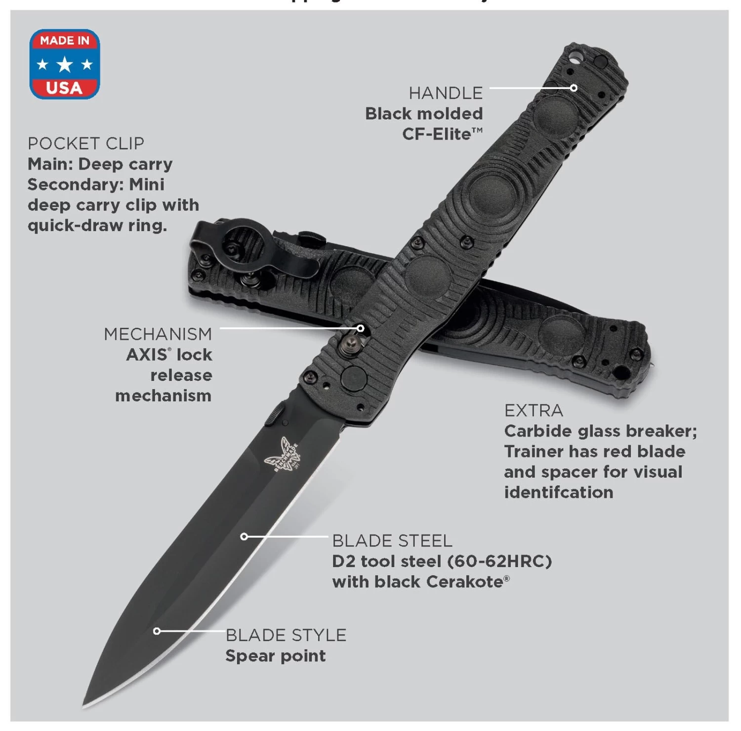 Designed by Greg Thompson, the new 391BK SOCP folder blade incorporates a myriad of functional features. The rapid deployment ring and tip-down carry enhance the speed at which this knife can be deployed, and the smooth handle dimples allow for confident transition in your hand. Redesigned with Benchmade’s AXIS lock technology, this knife won’t leave you fumbling for functionality in stressful situations. Carbide glass breaker on pommel.