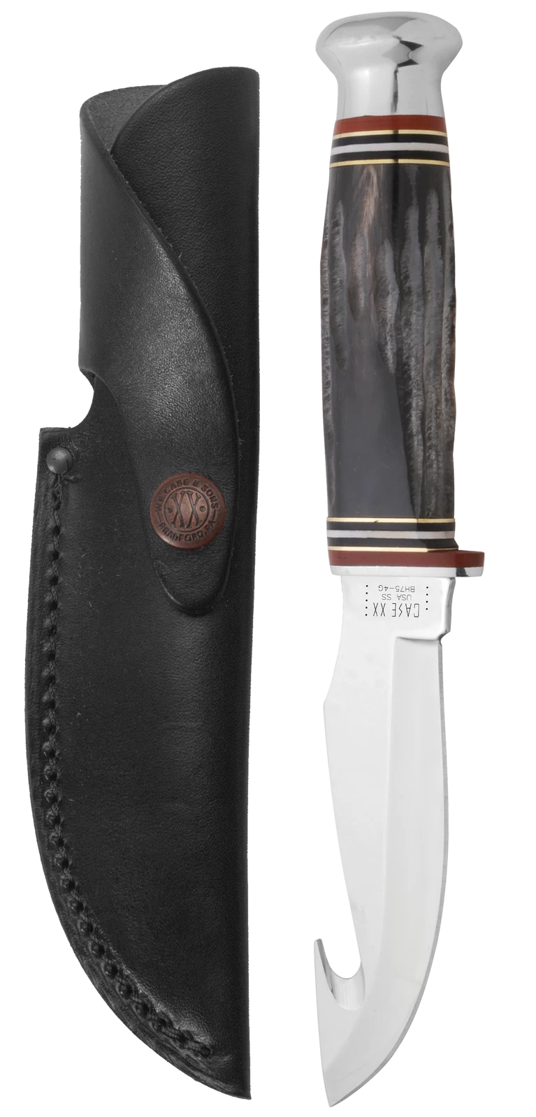 The Gut Hook Buffalo Horn Hunter is a part of Case’s Buffalo Horn Hunters family. This collection offers a natural handle material choice for our fixed blade hunters. Each is hand assembled from blade to end cap, then finished to perfection to perform just right for you. This fixed knife features a stainless sabre concave ground gut hook blade. This knife has a jigged buffalo horn handle along with an aluminum guard and end cap for a secure grip. The Gut Hook blade is commonly used for field dressing wild game, slicing, or skinning. This durable fixed blade knife is constructed with Case Tru-Sharpâ„¢ stainless steel which is a special high-carbon steel that helps the blades hold an edge longer than conventional steel. It also offers extraordinary blade strength and corrosion resistance. Comes with a genuine black leather sheath. This fixed blade knife is perfect for the outdoors, hunting, or hiking.