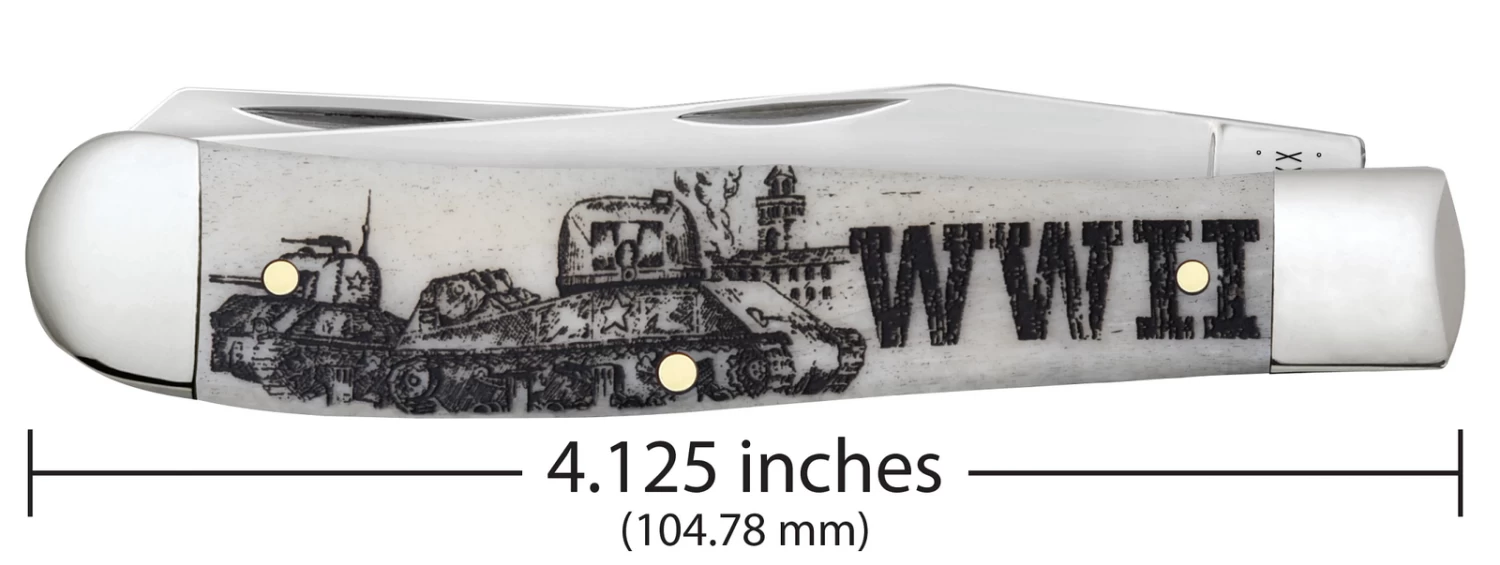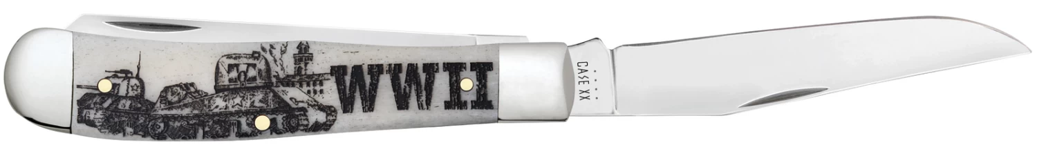 This all-new Trapper collection showcases some highly detailed handle artwork to help preserve the stories behind some of the USA’s most defining moments. The Trapper gets its name from the consumer it was designed for. Because of its basic trapping and skinning blades and its light weight, it is a must-have knife for those who trap small game. It is a jack knife with two full length blades; a slender Clip and a long Spey. The Clip blade is commonly used as a multi-purpose blade and preferred for detail work while the Spey blade is commonly used as an all-purpose utility blade. This knife is constructed with Case Tru-Sharpâ„¢ stainless steel which is a special high-carbon steel that helps the blades hold an edge longer than conventional steel. It also offers extraordinary blade strength and corrosion resistance.