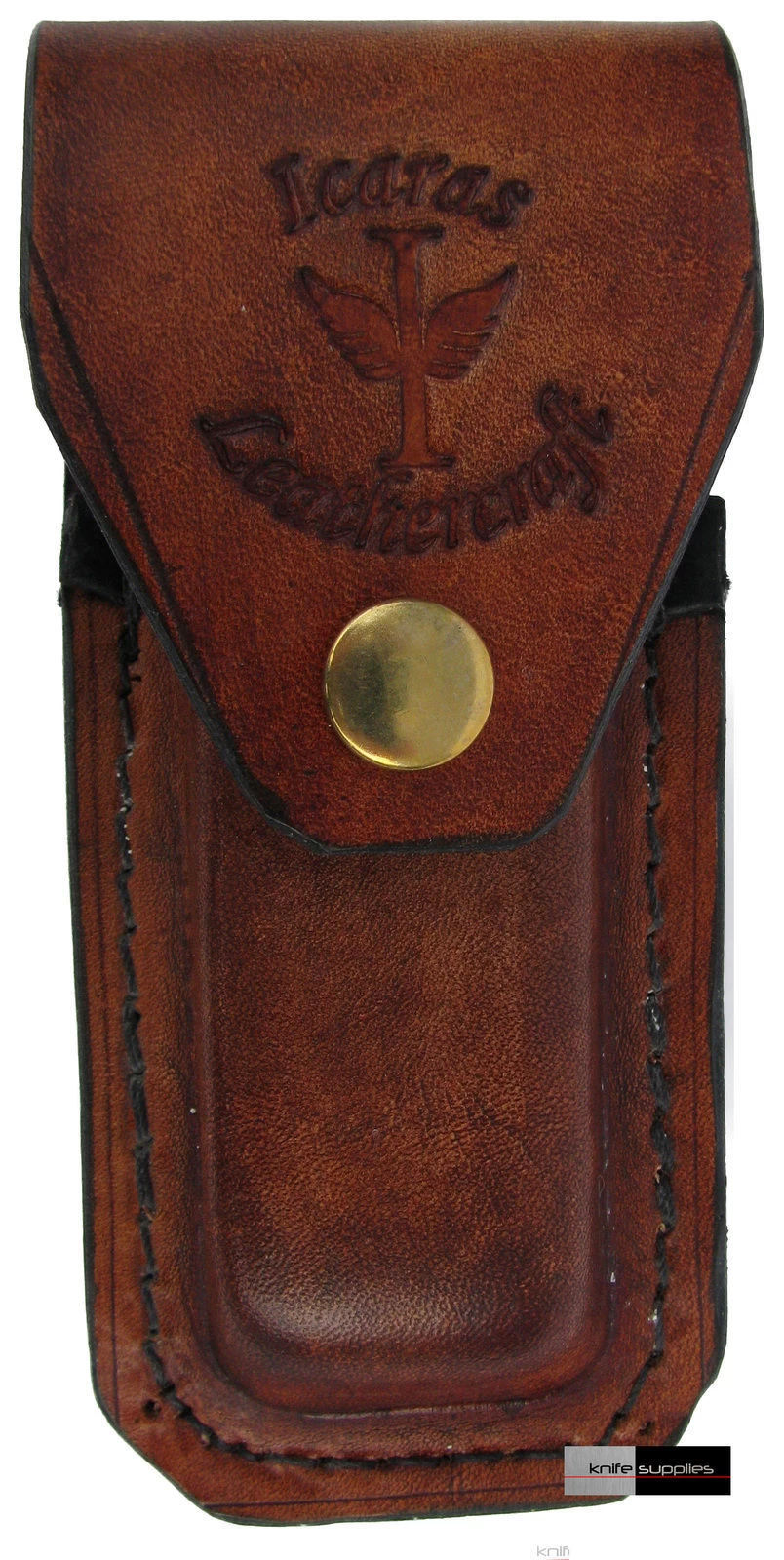 The belt sheath has been handmade in Tasmania Australia to perfectly fit a standard 4″ (100mm) stockman knife or similar sized knife.  The sheath front is Pig Skin lined to protect the knife from scratching by front snap.  Sheaths employ the best quality hand dyed tool leather and brass snap stud. A unique design allows the sheath to be worn both vertically and horizontally on the belt. The sheath will “break in” and soften with use over time like any good pair of boots.