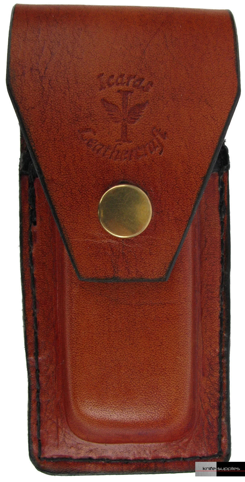 The belt sheath has been handmade in Tasmania Australia to perfectly fit a standard 4″ (100mm) stockman knife or similar sized knife. The sheath front is Pig Skin lined to protect the knife from scratching by front snap. Sheaths employ the best quality hand dyed tool leather and brass snap stud. A unique design allows the sheath to be worn both vertically and horizontally on the belt. The sheath will “break in” and soften with use over time like any good pair of boots.