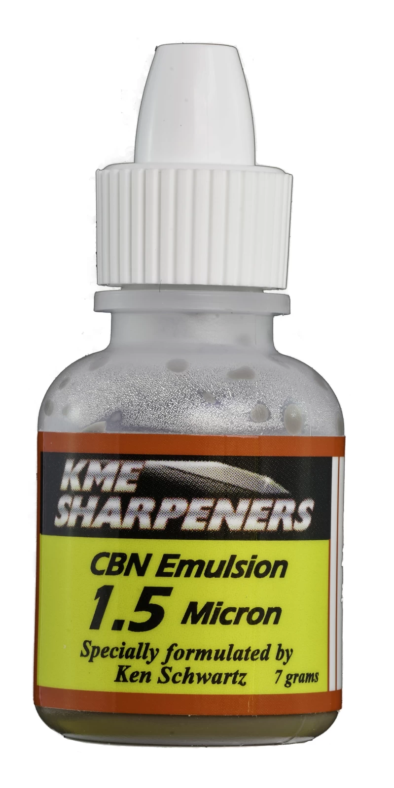Cubic Boron Nitride (CBN) is second only to diamond in hardness and is similar to man made diamond. It is an exceptional finishing and polishing micro-abrasive. KME brand CBN emulsions are specially formulated by sharpening stone and micro-abrasive expert Ken Schwartz and are available in grits ranging from 4 micron (4000 grit) down to an incredible mirror polishing .1 (1/10th) micron size (160,000 grit).