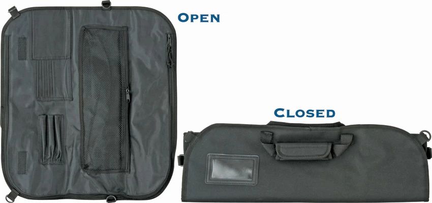 Center storage area holds 8 straight knives measuring up to 18″ overall, and features full zip closure. Interior features mesh zip pocket and various sleeves for pens, credit cards, etc. Folded case secures with velcro closure. Black nylon exterior with window for identification card. Carry handle and removable shoulder strap.