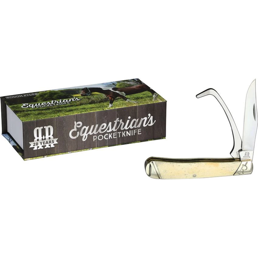 The handles are Natural White Bone with nickel silver pinched Slant ‘R’ bolsters and Rough Ryder shield. The Equestrian knife was designed for those who love and take care of horses. Built on a Trapper, the Clip blade and hoof pick make this knife a great tool for both horses and riders. The Clip blade is a multi-purpose blade that is preferred for its versatility. The hoof pick is a common tool for those that care for horses. Each knife comes with a decorative magnetic clasp collector’s box.