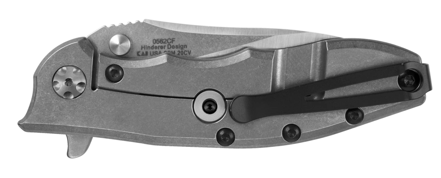 The 0562CF, from ZT and Rick Hinderer is the dressed-up version of the popular 0562. With a carbon fiber front scale and Rick’s “slicer” grind, this top performer is ready to take on your next task. The blade has a sweet slicing edge, but also supports the blade tip to make it excellent for piercing, too. The 0562CF’s handle has a carbon fiber front scale and stonewashed titanium back. For secure lock up during use, ZT uses a frame lock with hardened steel lockbar inserts and lockbar stabilization.