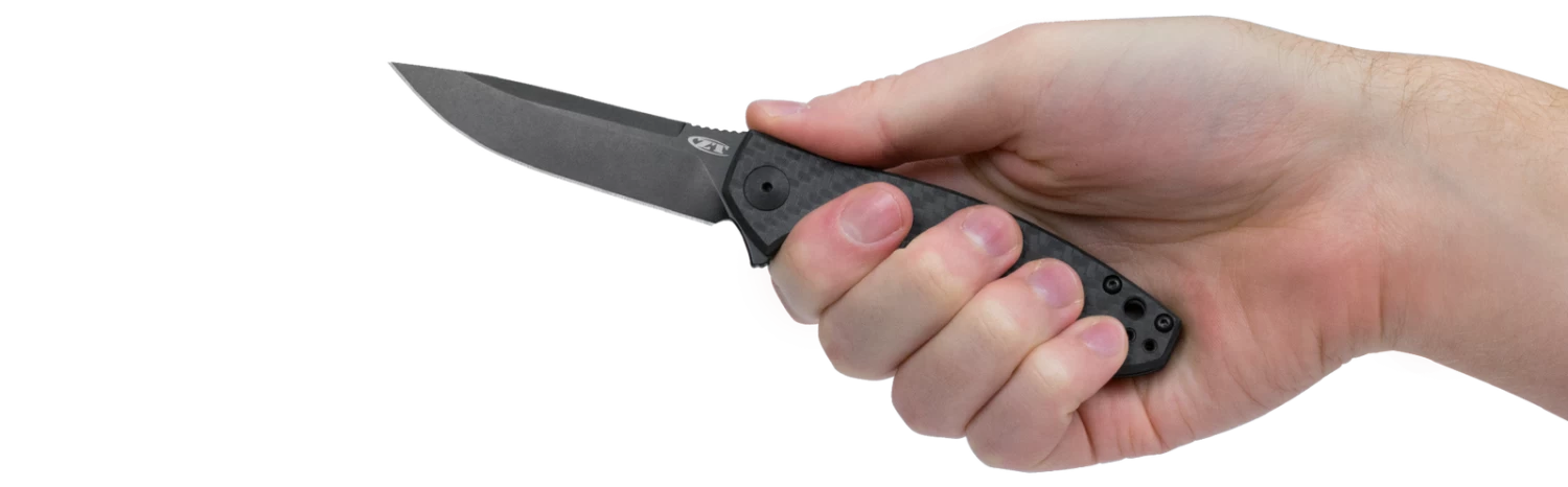 This sophisticated ZT is a smaller option that offers a robust combination of premium-quality materials. The front handle is carbon fiber, balancing the knife’s solid construction with lightweight convenience. The DLC-coated titanium back handle offers a secure frame lock—so you can always cut with confidence. As an extra visual touch, ZT added two eye-catching emerald-green tube spacers that stand out attractively against the dark handle.