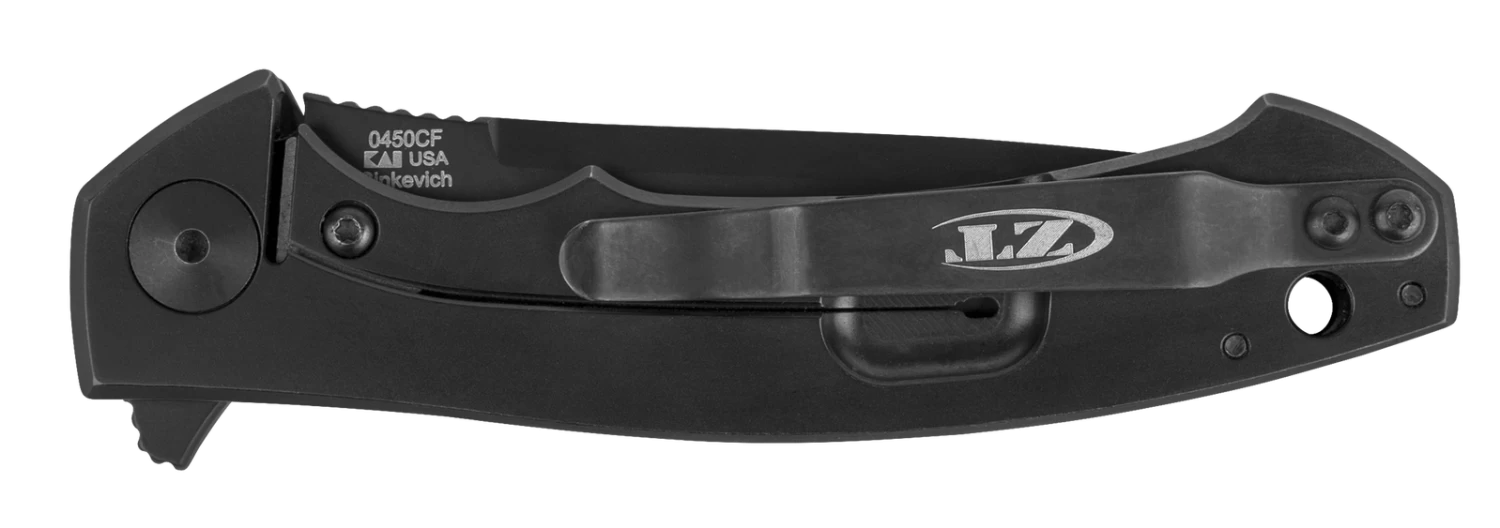 - Carbon fiber front scale with black DLC-coated steel back; secure frame lock