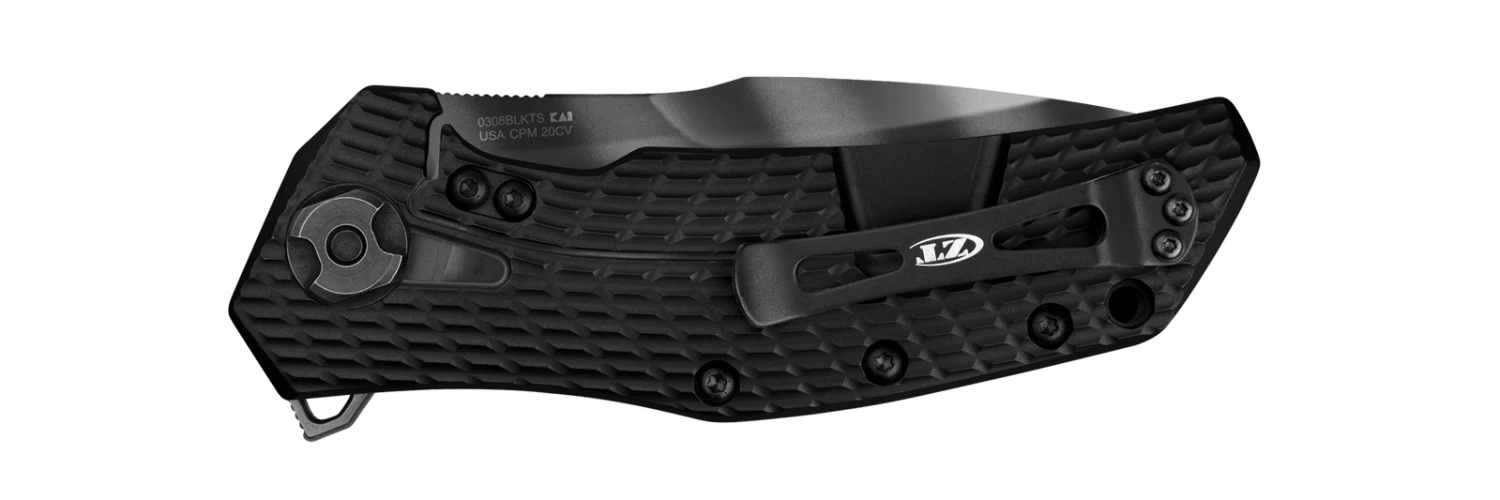 For the first time ever, ZT is using a black-oxide BlackWash finish with its classic tiger stripe pattern. The 0308BLKTS offers a beefy 3.7-inch tiger stripe blade with premium CPM 20CV blade steel. The handle features black G10 on the front scale with a titanium back. Both the front and back are heavily 3D machined for an ultra-secure grip. The .25-inch solid pivot features a custom nut that enables it to be adjusted in the field with a 1/2-inch wrench. The pocketclip hole pattern is compatible with many after-market clips.